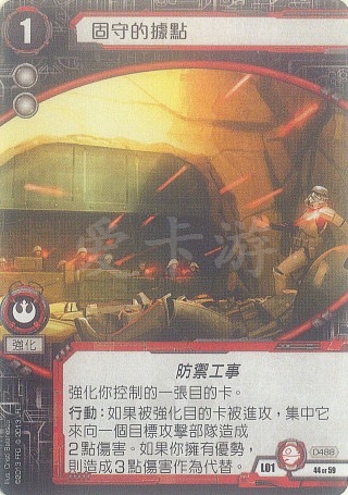 行动:如果被强化目的卡被进攻,集中它来向一个目标攻击部队造成2点伤害。如果你拥有优势,则造成3点伤害作为代替。
