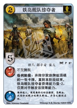 任何阶段:弃除你家族牌组顶端的一张卡牌,直到本阶段结束,铁岛舰队掠夺者获得能力值-2。仅限对手触发该效果能力。