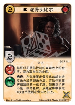 :在你横置老骨头比尔成为进攻角色或防御角色后,弃除你家族牌组顶端的一张卡牌。如果该卡牌不是一张角色牌,从藏宝库中获取1枚金币到老骨头比尔上。