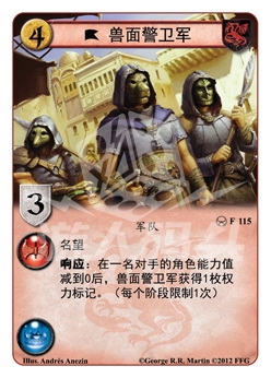 响应:在一名对手的角色能力值减到0后,兽面警卫军获得1枚权力标记。(每个阶段限制1次)