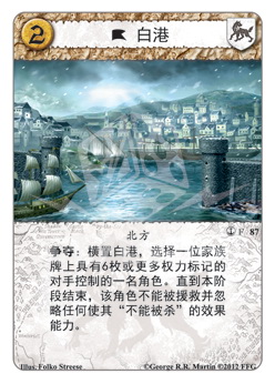 争夺:横置白港,选择一位家族牌上具有6枚或更多权力标记的对手控制的一名角色。直到本阶段结束,该角色不能被救援并忽略任何使其“不能被杀”的效果能力。