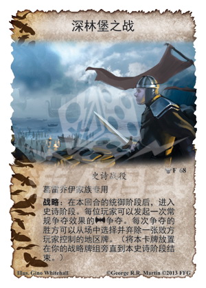 战略:本回合的统御阶段后,进入史诗阶段,每位玩家可以发起一次常规争夺效果的军事争夺争夺,每次争夺的胜方可以从场中选择并弃除一张败方玩家控制的地区牌。(将本卡牌放置在你的战略牌组旁直到本史诗阶段结束。)