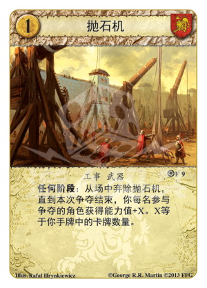 :从场中弃除抛石机,直到本次争夺结束,你每名参与争夺的角色获得能力值+X。X等于你手牌中的卡牌数量。