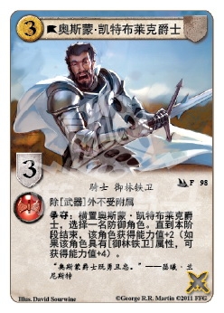 争夺:横置奥斯蒙·凯特布莱克爵士,选择一名防御角色。直到本阶段结束,该角色获得能力值+2(如果该角色具有[御林铁卫]属性,可获得能力值+4)。