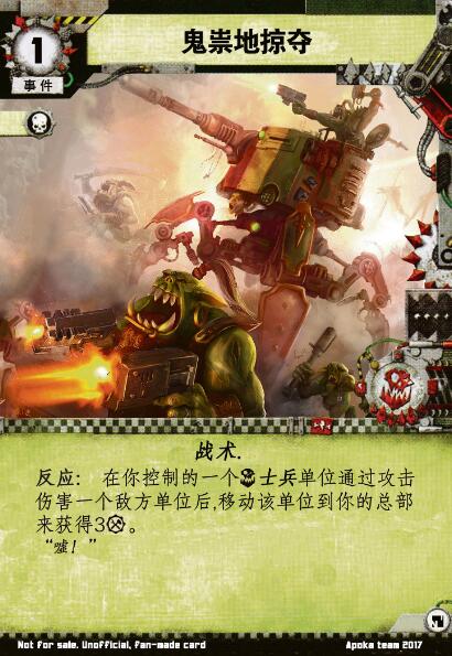 反应:在你控制的一个兽人士兵单位通过一次攻击伤害一个敌方单位后,移动该单位到你的总部来获得3资源。